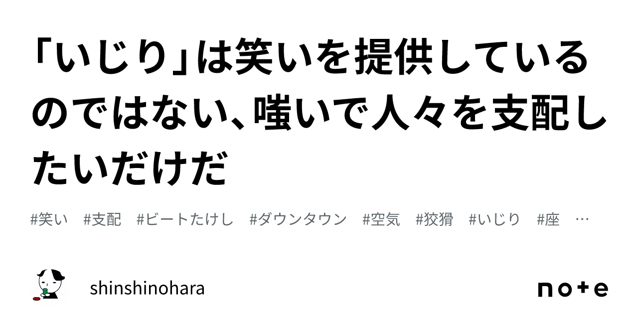 「いじり」は笑いを提供しているのではない、嗤いで人々を支配したいだけだ|shinshinoharaビートたけしに始まり、ダウンタウンが引き継いだ「いじり」という手法は、集団を「嗤(わら)い」で支配できるということを子どもたちに示してしまった面があるように思う。 頭の回転がよく、言葉巧みな強者は、特定の人間を「いじられキャラ」に仕立てるこ... - note.com「【快適】テレビを見ない生活が想像以上に良かった件」