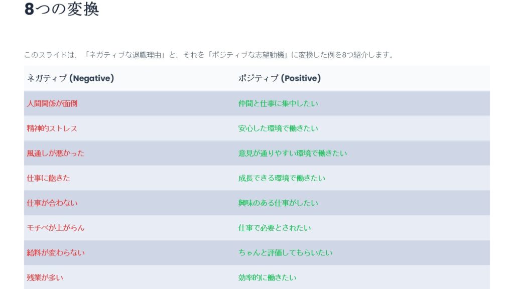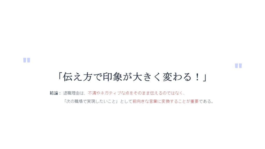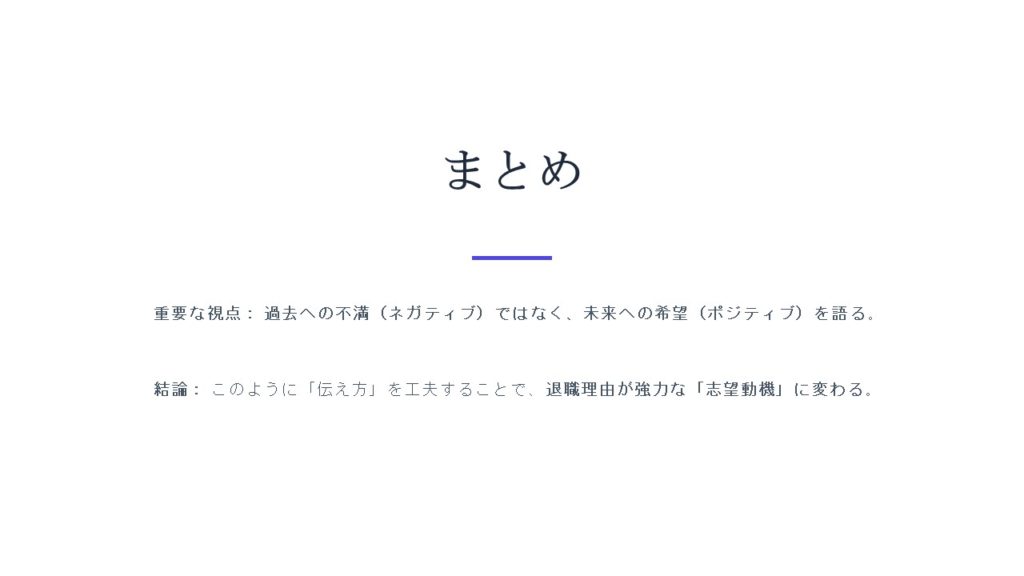 人事が好印象を持つ 「退職理由」の伝え方 スキルアップ X Facebook はてブ LINE Pinterest コピー 2025.11.09 Geminiさんにスライドを作ってもらいました! 注意 ・Amazonのアソシエイトとして、双子のドラ猫は適格販売により収入を得ています。 ・この記事は情報提供を目的としたものであり、医学的・法律的なアドバイス等の専門情報を含みません。何らかの懸念がある場合は、必ず医師、弁護士等の専門家に相談してください。 ・記事の内容は最新の情報に基づいていますが、専門的な知見は常に更新されているため、最新の情報を確認することをお勧めします。 ・記事内に個人名が含まれる場合、基本的に、その個人名は仮の名前であり実名ではありません。